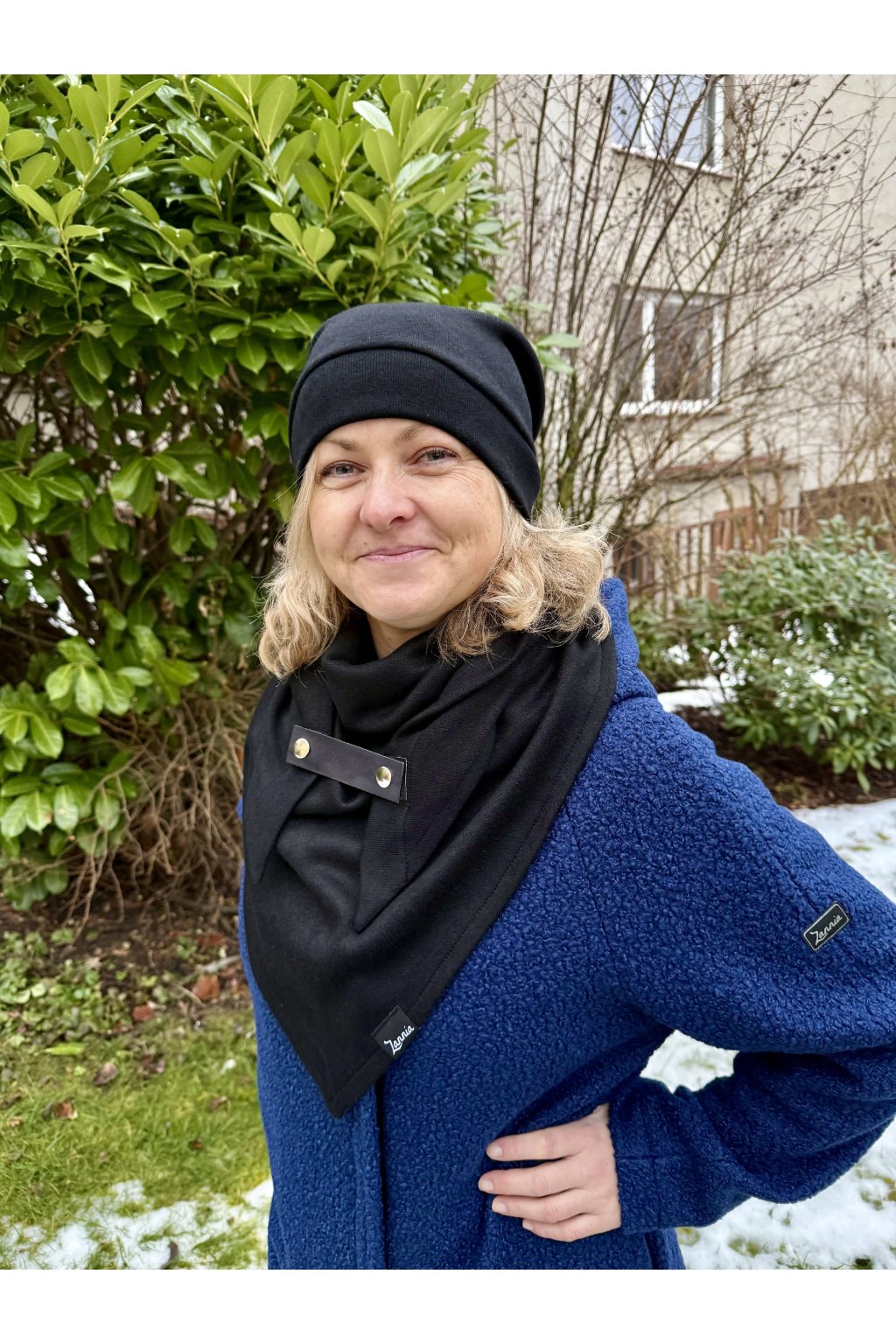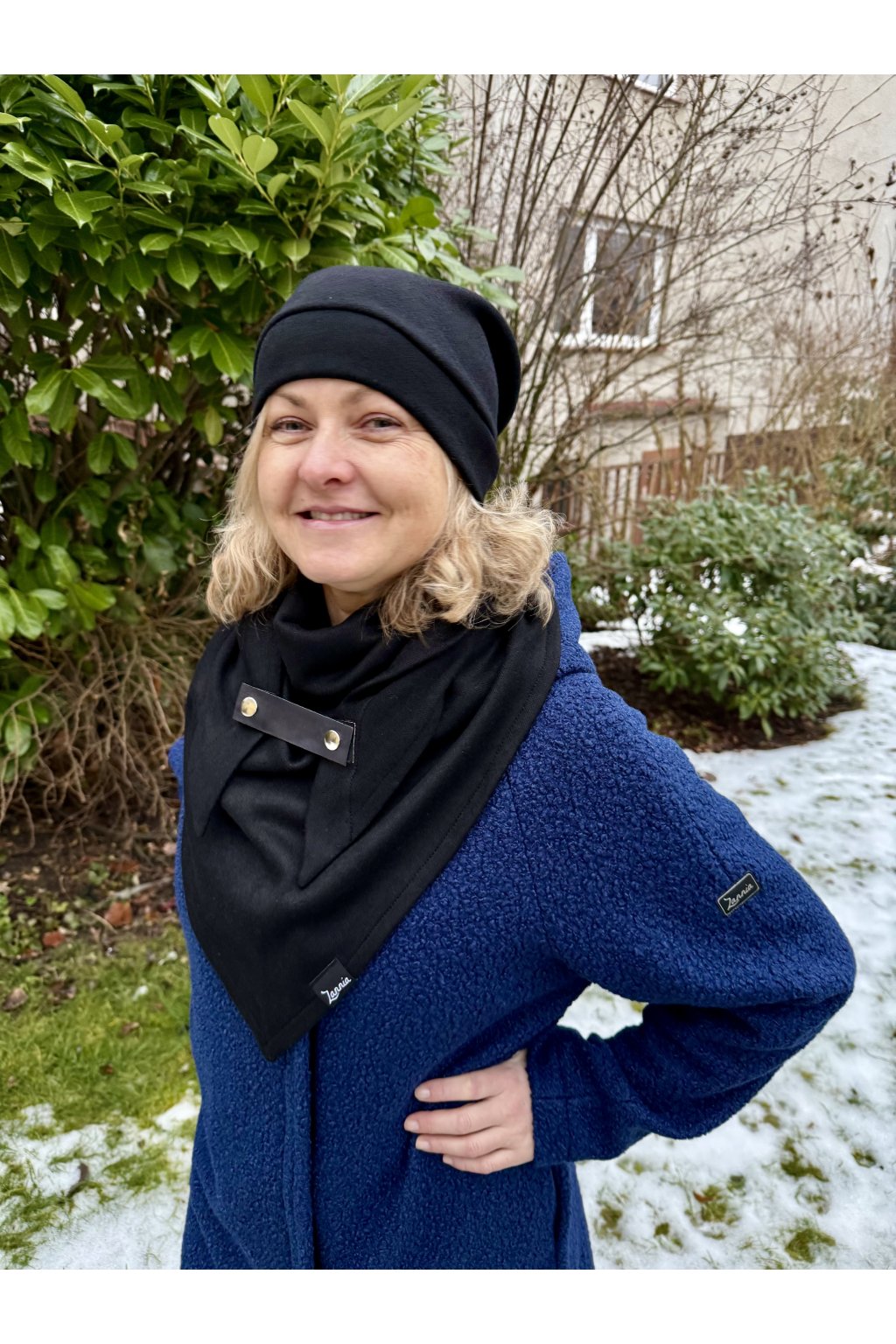 Šátek Zannia ve tvaru trojúhelníku i čepice jsou je ušitý z kvalitního pleteninového úpletu s vysokým obsahem viskózy.
