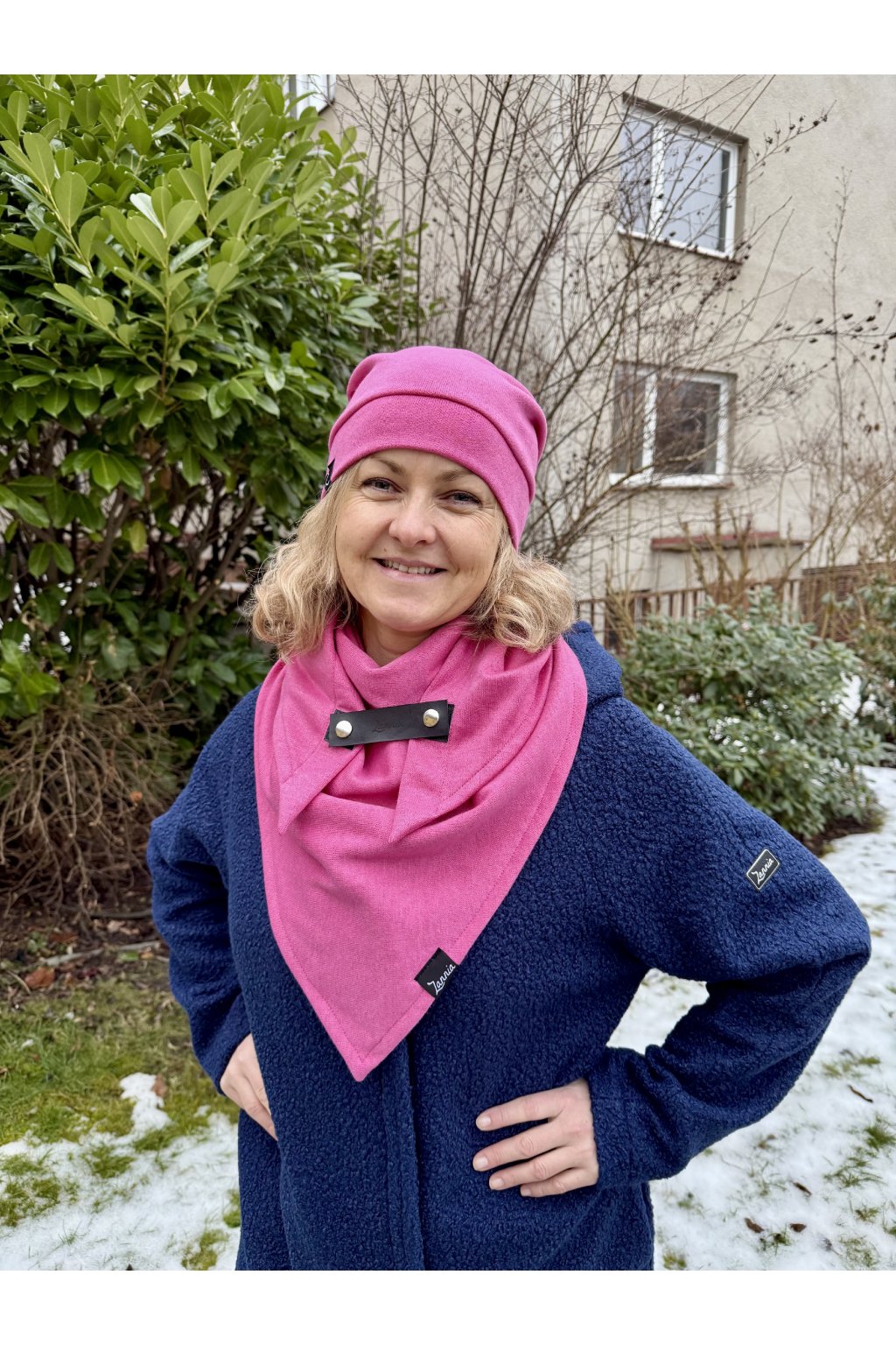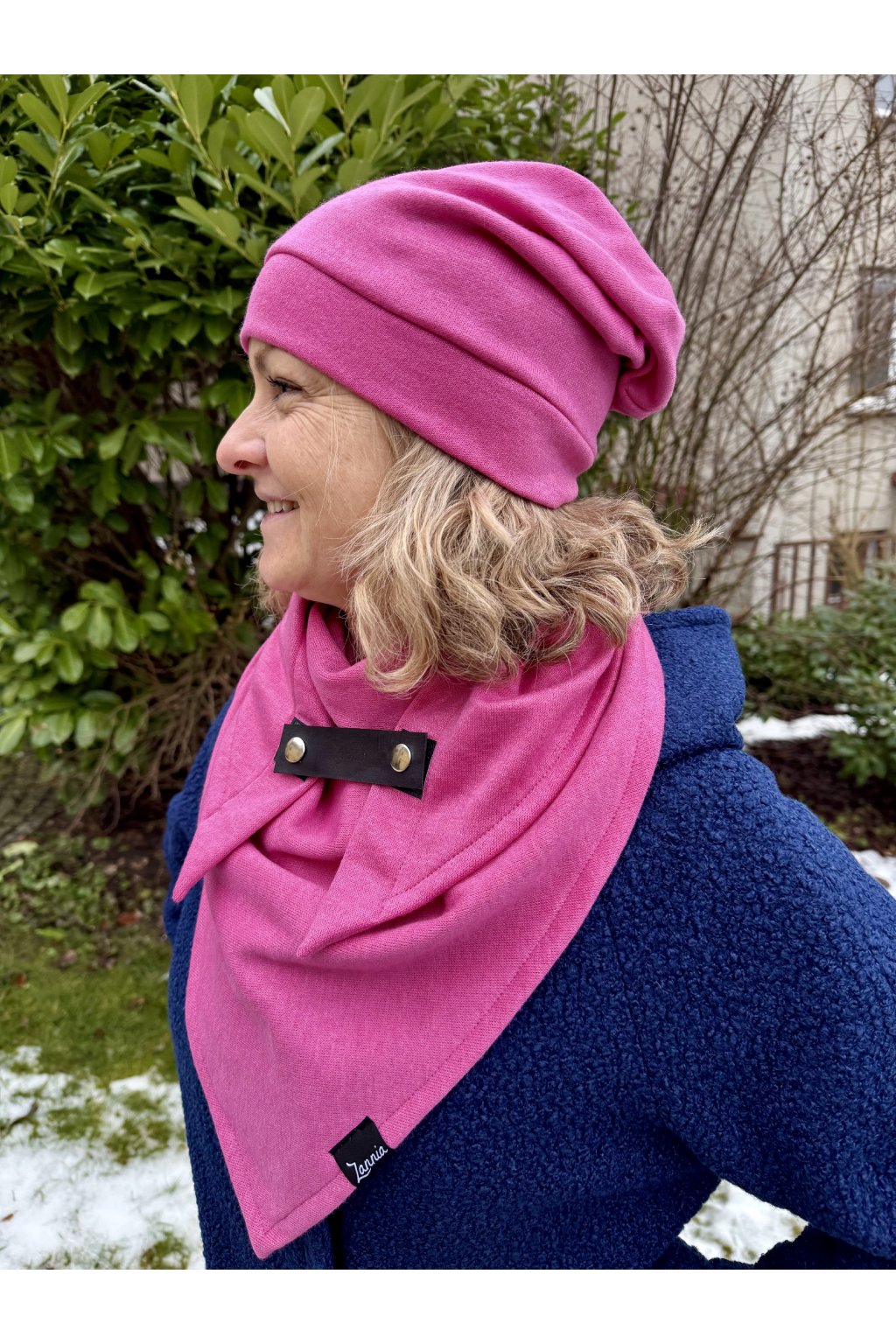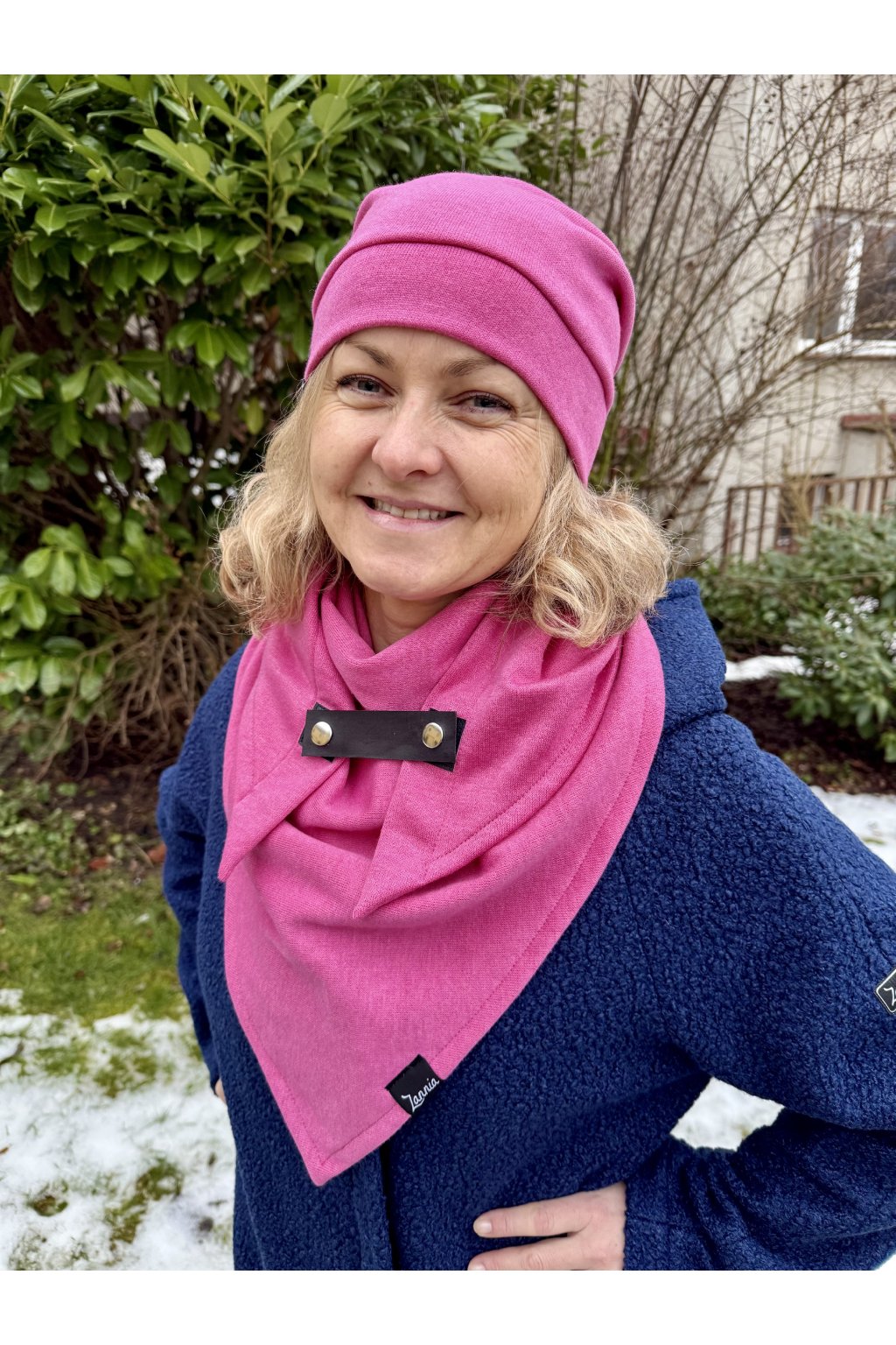 Šátek Zannia ve tvaru trojúhelníku i čepice jsou je ušitý z kvalitního pleteninového úpletu s vysokým obsahem viskózy.