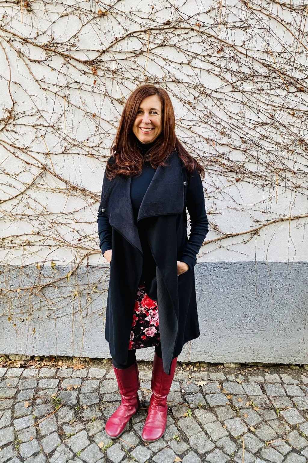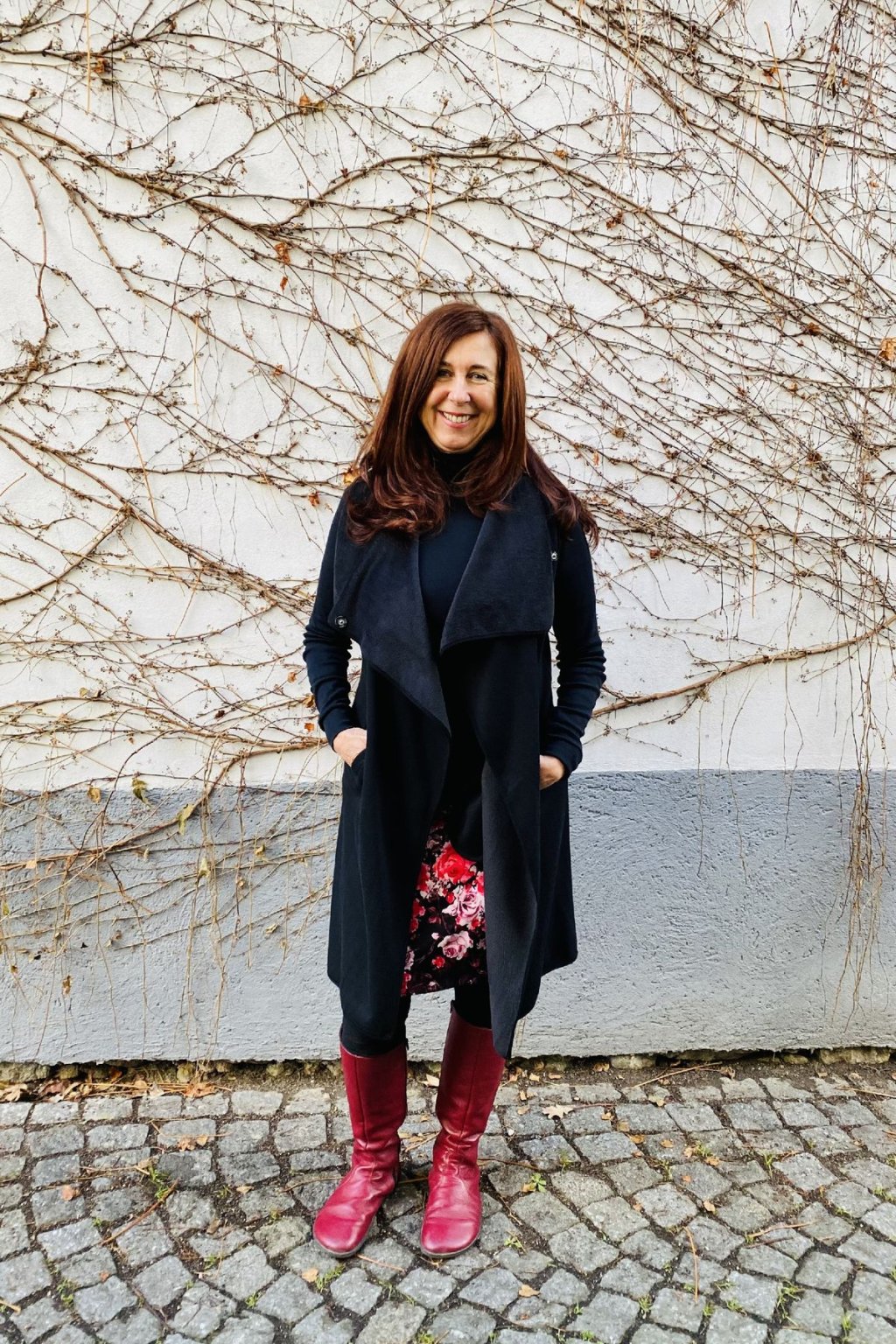 Dámská, stylová, snadno kombinovatelná a hřejivá vesta z červeného warmkeeperu, olemovaná černou lemovkou, s kapsami vsazenými v bočních švech.